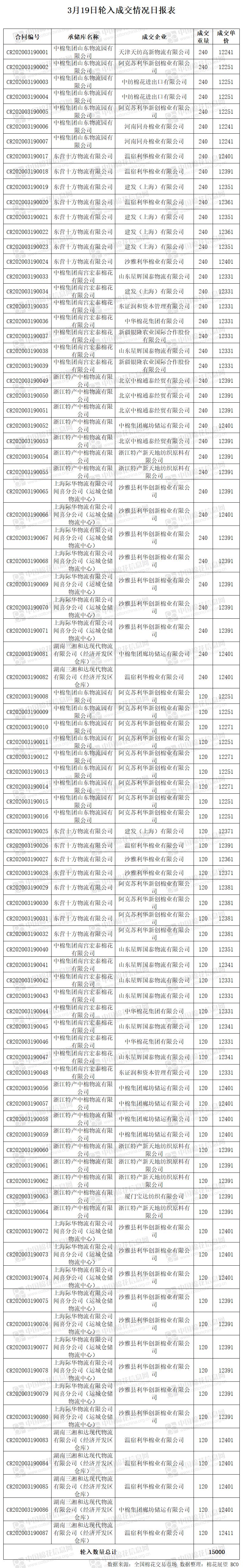 3月19日新疆棉轮入上市数量15000吨,实际成交15000吨,成交率100%。今日平均成交价格为12353元/吨,较前一日成交均价下跌546元/吨。