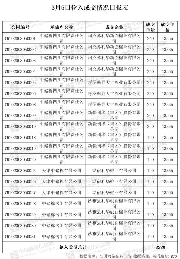 3月5日新疆棉轮入上市数量15000吨,实际成交3280吨,成交率21.87%。今日平均成交价格为13565元/吨,较前一日上涨16元/吨。